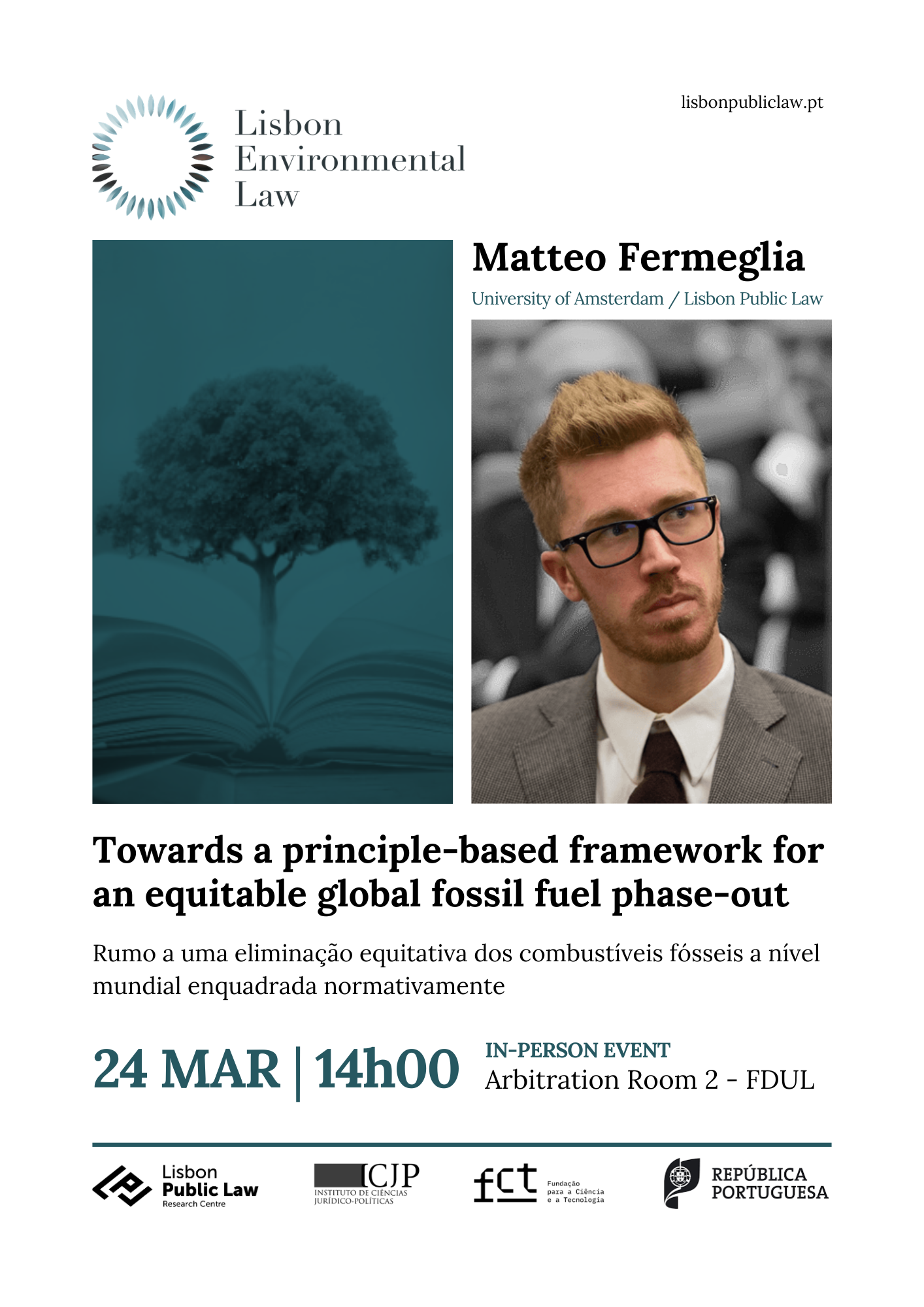 Next week, we will be welcoming researcher Matteo Fermeglia for a Lisbon Environmental Law workshop, where he will discuss “Towards a principle-based framework for an equitable global fossil fuel phase-out”. Join us on 24 March at 2:00 pm, in Room Arbitragem 2, FDUL.