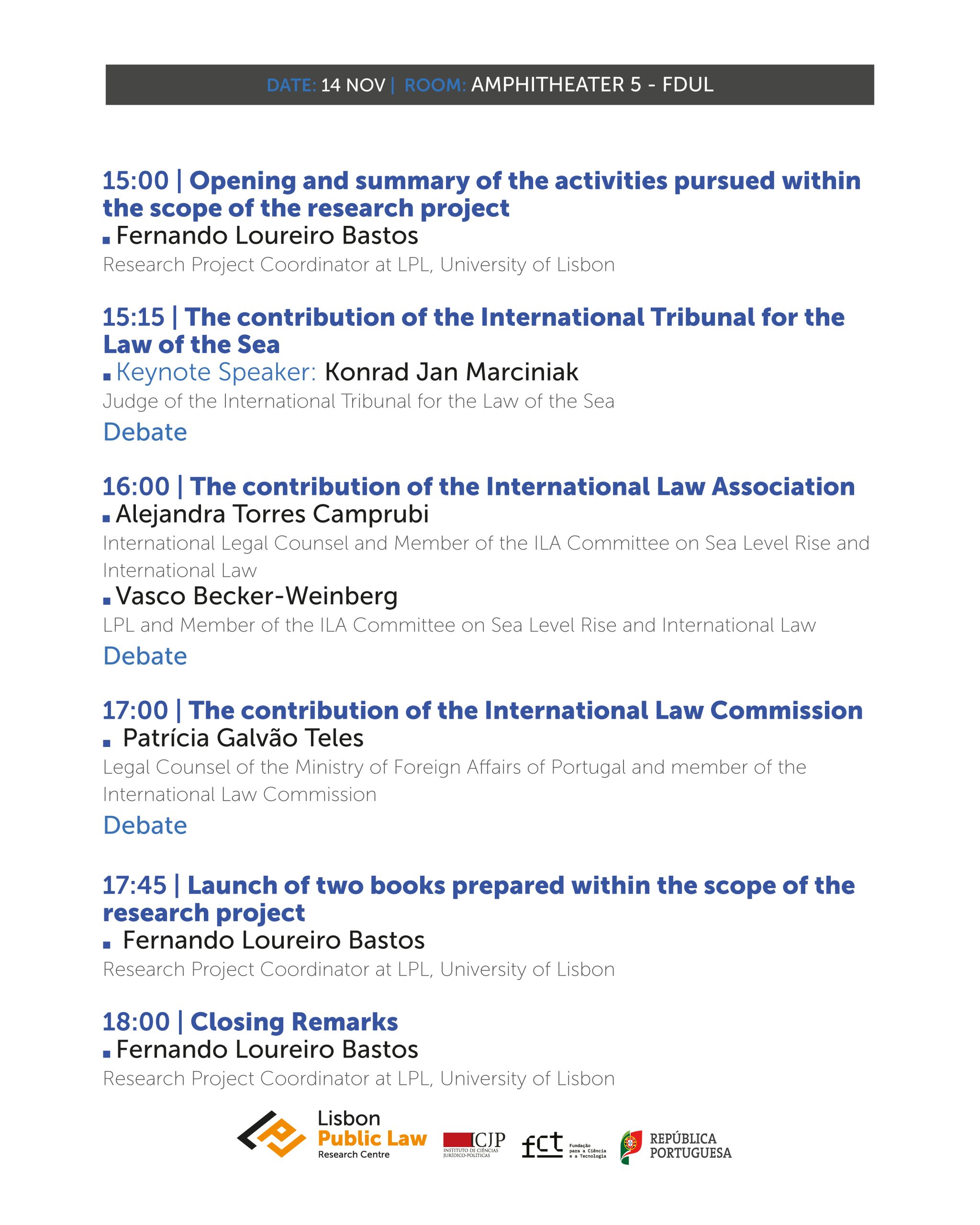 Chega ao fim o projeto de investigação do LPL, “Em preparação para a subida do nível do mar: lidando com as alterações climáticas, reestruturando o território dos Estados e procurando mecanismos para a resolução de conflitos”, coordenado pelo Professor Fernando Loureiro Bastos. A conferência de encerramento terá lugar no próximo dia 14 de novembro, na FDUL. Para além da apresentação e análise das principais atividades e resultados do projeto, o evento incluirá também o lançamento de dois livros, fruto da investigação desenvolvida no seu âmbito.